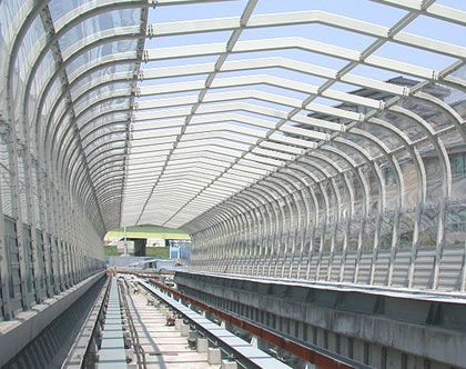 7、美觀可塑:根據不同需要可采用與金屬材料及透光材料組合的結構形式,也可噴涂各種色彩及圖案,以達到景觀裝飾要求。